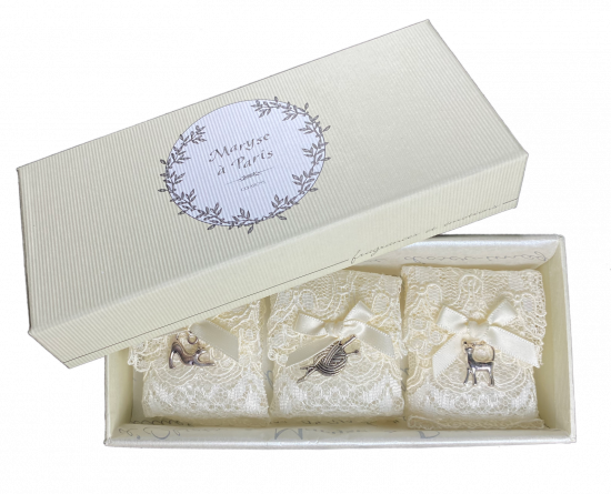 Maryse à Parisはフランス生まれのブランドで、可愛いフランスならではの小物をデザインしています。この猫をテーマにしたニオイ袋のシリーズは、愛らしい猫のデザインとフランスらしいお花の香りが特徴です。各袋には白ユリやジャスミン、マグノリアの香りがついたビーズがフランスレースに包まれ、小さなテーマごとのカデナがついています。カデナは取り外して、ペンダントチップやブレスなどにもアレンジ可能です。